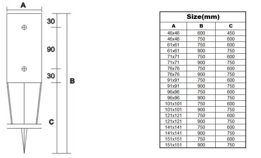 Size: The post spike measures from 60 to 120 cm in length and has several dimensions. The sizes are suitable for various posts with corresponding measurements, providing flexibility in its use.
